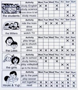 Study English/science/music/history(英語・化学・音楽・歴史を勉強する), have show and tell(発表をする), ride the train(電車に乗る), drive(運転する), clean(掃除をする), watch TV(テレビを観る), play bingo(ビンゴをする), go to church/school(教会・学校に行く),swim(泳ぐ), play volleyball/soccer,(バレーボール・サッカーをする), go to the library/park(図書館・公園へ行く),eat together(一緒に食べる), read(読む)