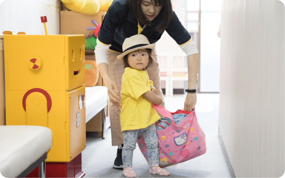 朝から元気よく英語で「Good morning!」 ママとさよならして自分のロッカーに荷物の片付け。