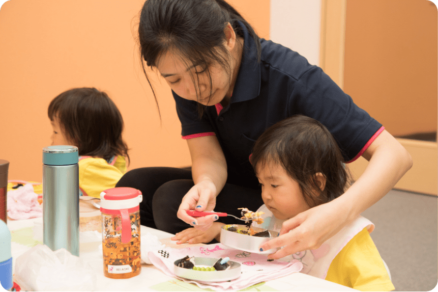 先生たちがサポートをしながら、少しずつ自分で食べられるように指導していきますのでご安心下さい。また、お母さんたちにもお弁当の中身を工夫して頂き、手で食べられるものなど、食べやすいものを持たせて頂けると幸いです。