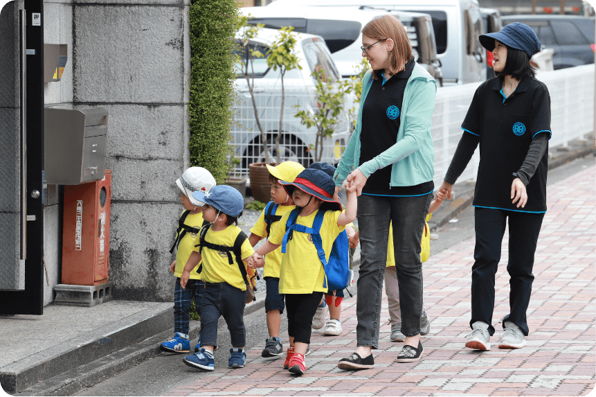 外出する時には、絶対に手を離さないことや、飛び出したりしないことなど、外出時の約束事を毎回時間をかけて説明しています。本校のレッスンは全て英語で行っていますが、このような約束事を話すときは、生徒さんたちがきちっと理解できるまで、日本語も含めて説明しています。複数の先生たちで細心の注意を払いながら外出をしていますので、ご安心下さい。